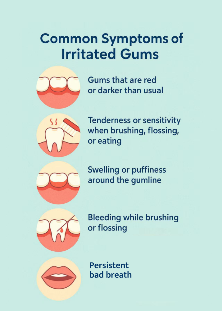 The tricky part? Irritated gums don’t always look alarming at first. They might just feel a bit tender or swollen, or bleed a little when you floss. But these are important signs that shouldn’t be ignored.