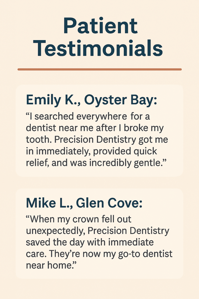At Precision Dentistry in Oyster Bay, Long Island, we understand that dental emergencies can happen at any time. From severe toothaches that demand immediate pain relief to acute dental injuries requiring prompt care, we are prepared to handle it all. If you’re experiencing any symptoms or have pain or discomfort of any kind, do not delay in contacting us or call 516-922-5730.